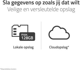 - Opslag: microSD tot 128 GB of beveiligde cloudopslag