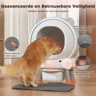 De E2 beschikt over meerdere beveiligingen: een anti-pinch systeem dat direct stopt bij detectie van uw kat en gecombineerde infrarood- en zwaartekrachtsensoren. Het reinigingssysteem kantelt de bak gedeeltelijk via een betrouwbaar draaisysteem — veilig ontworpen zodat uw huisdier nooit in gevaar komt.